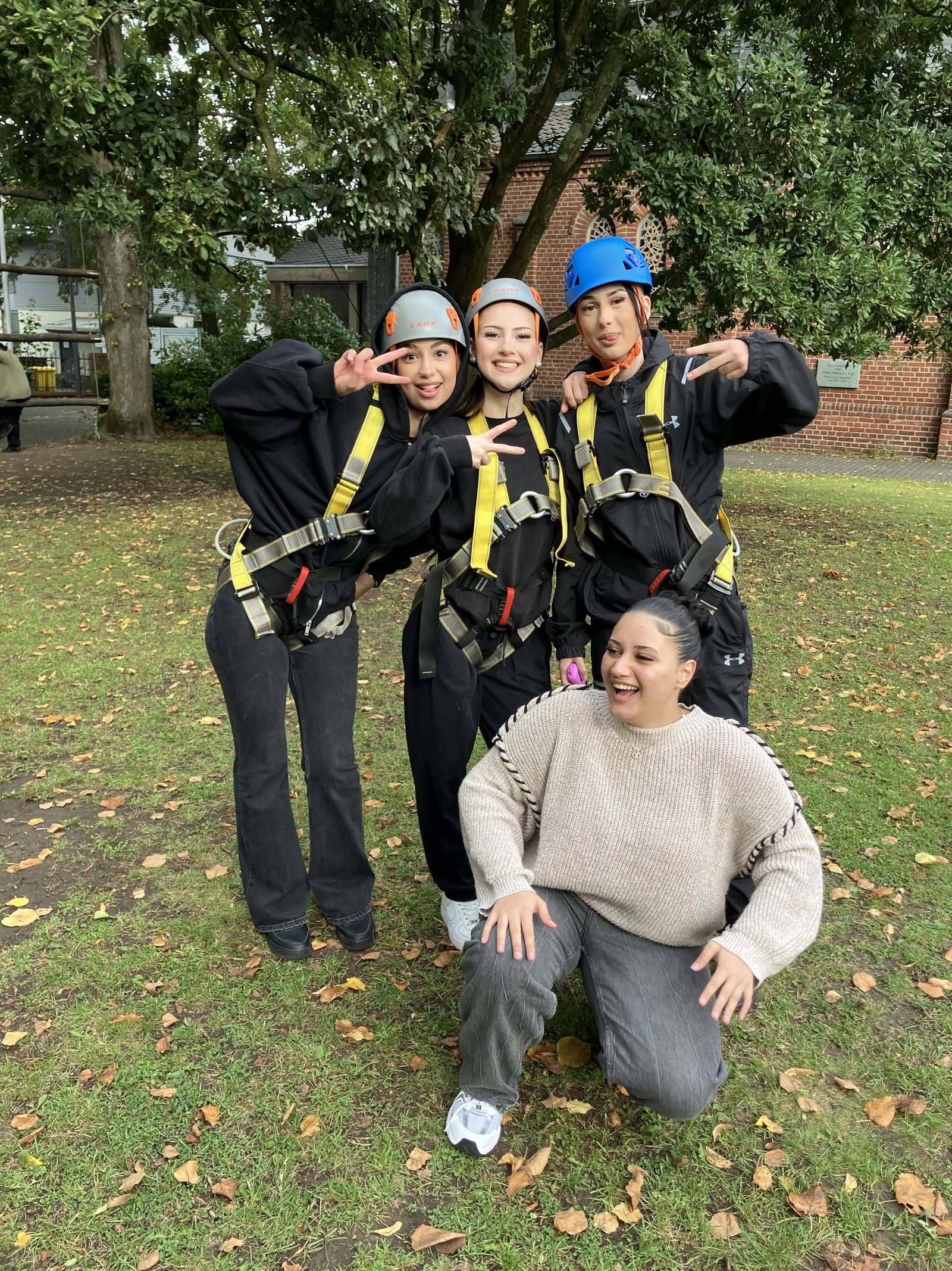Kletteraktion mit TEAMO in Kooperation mit der Clearingstelle. Wir trafen uns zunächst auf dem Gelände des St. Engelnberg und erhielten eine theoretische und praktische Einführung in das notwendige Klettergeschirr. Danach wurde gezeigt, wie die jeweilige Absicherung im „3er-Team“ funktioniert. Und dann ging es auch schon los. 2 große Bäume, die jeweils mit unterschiedlich-schweren Kletterelementen bestückt waren, sollten möglichst hoch erklommen werden. Es zeigte sich, dass die Mädels klar den Ton; oder hier besser gesagt, die Maximalhöhe, vorgaben. Nach mehreren Versuchen von verschiedenen, mutigen Schülern, ging es dann zur Teamaufgabe. Dabei sollte die sogenannte „Himmelsleiter“ erklommen werden. Mehrere lange Holzbalken, die horizontal zwischen 2 Bäumen auf Seilen eingehängt waren, befanden sich in unterschiedlichen, vertikalen Abständen. Das heißt; jede nächsthöhere Ebene konnte nur mit Hilfe der beiden anderen Teilnehmern im Team erklommen werden. Es war einfach unglaublich, wie auch hier die Mädelsgruppe motiviert und unter vollem Einsatz Balken für Balken erkletterten.